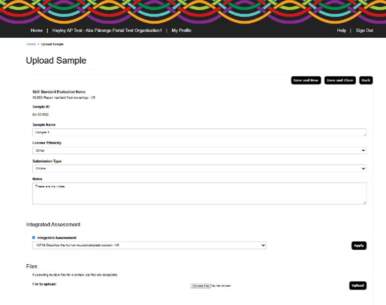 To avoid uploading the same sample multiple times for standards where an integrated assessment was done, you can select the ‘Integrated’ option on the sample record. A selection box will appear with a list of the skill standards available on this moderation request. Select the other applicable skill standards the assessment was for and proceed with uploading the relevant files. The system will recognise the sample across all selected skill standards.